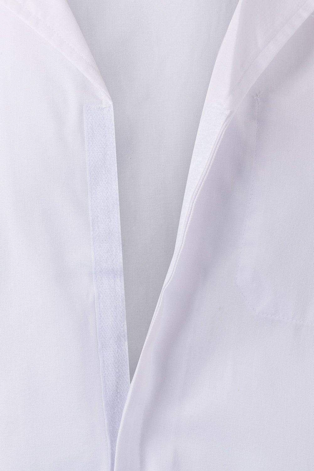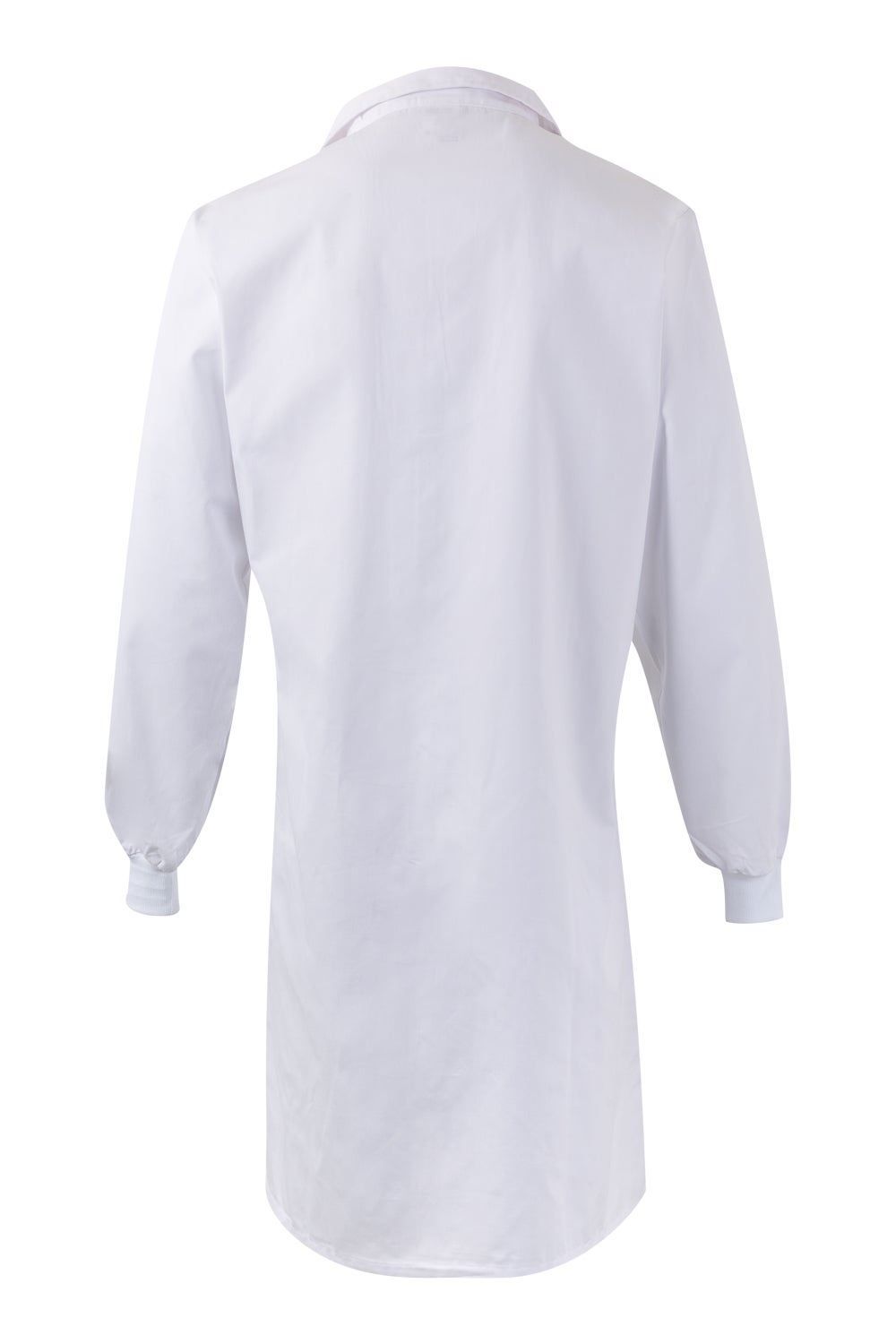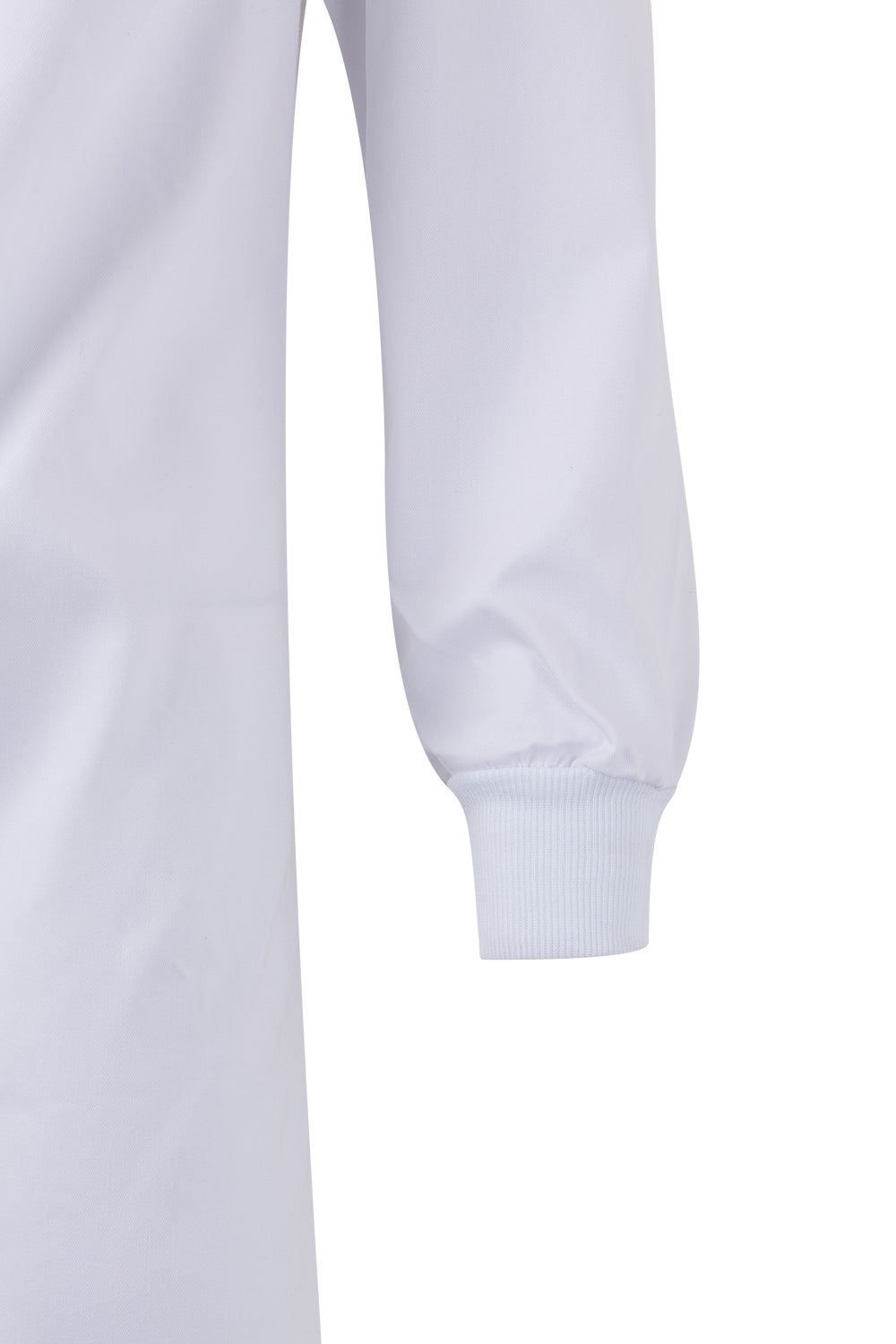 Bata con cierre de velcro en color blanco. Cuenta con un bolsillo de parche en el pecho.