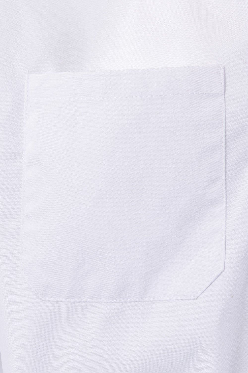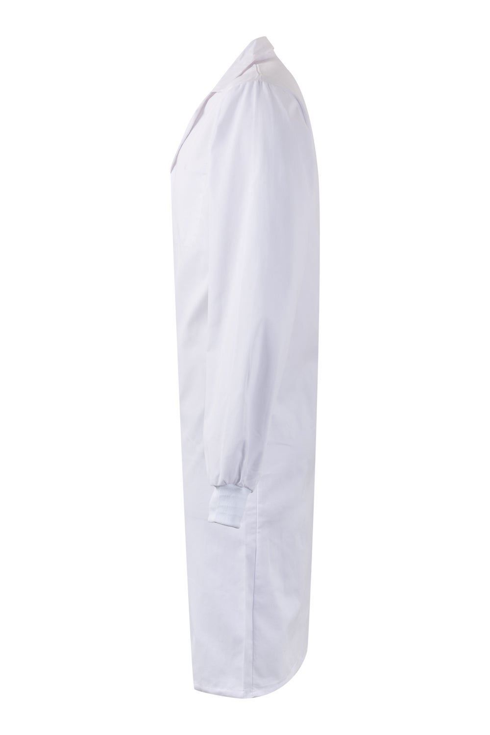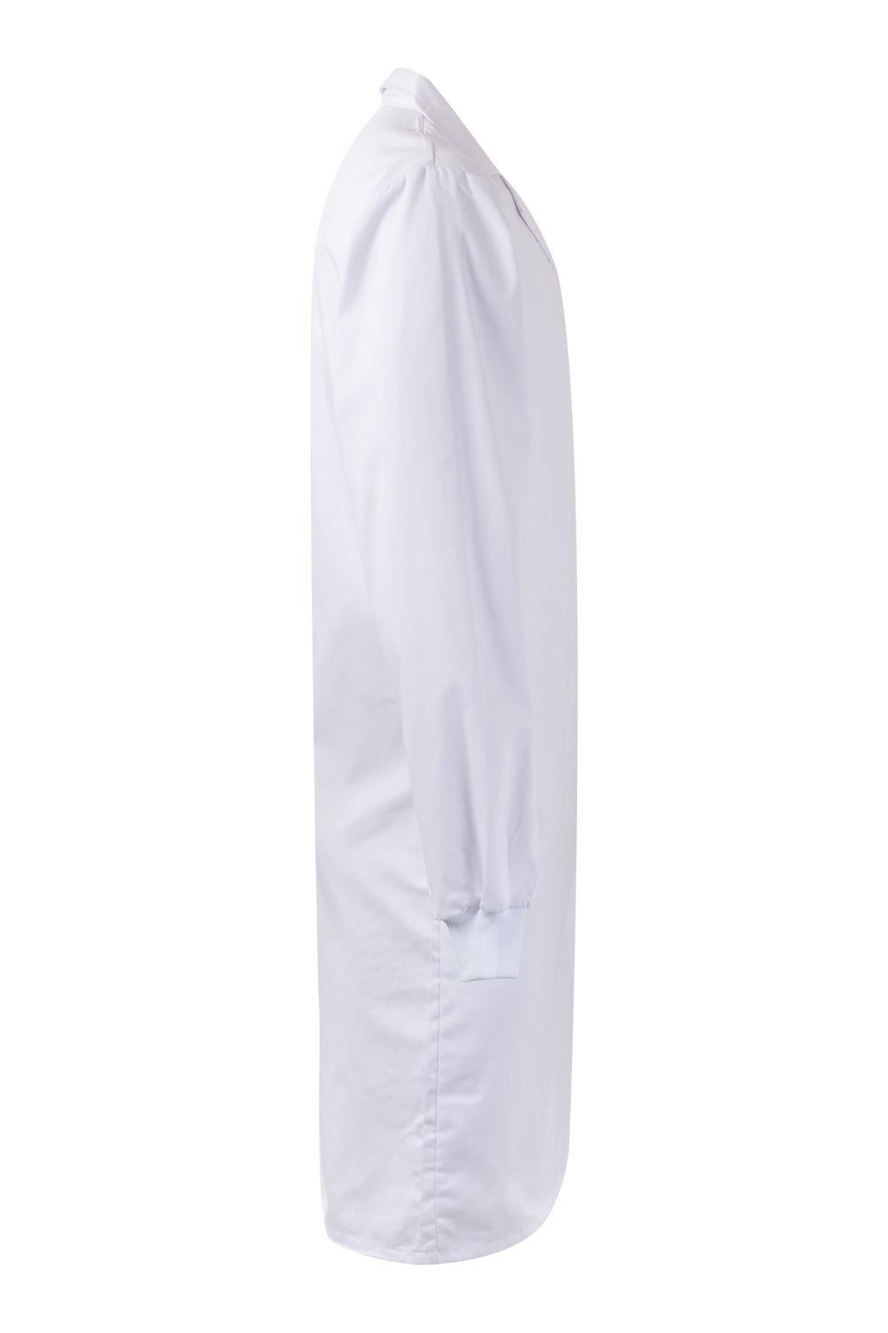 Bata con cierre de velcro en color blanco. Cuenta con un bolsillo de parche en el pecho.