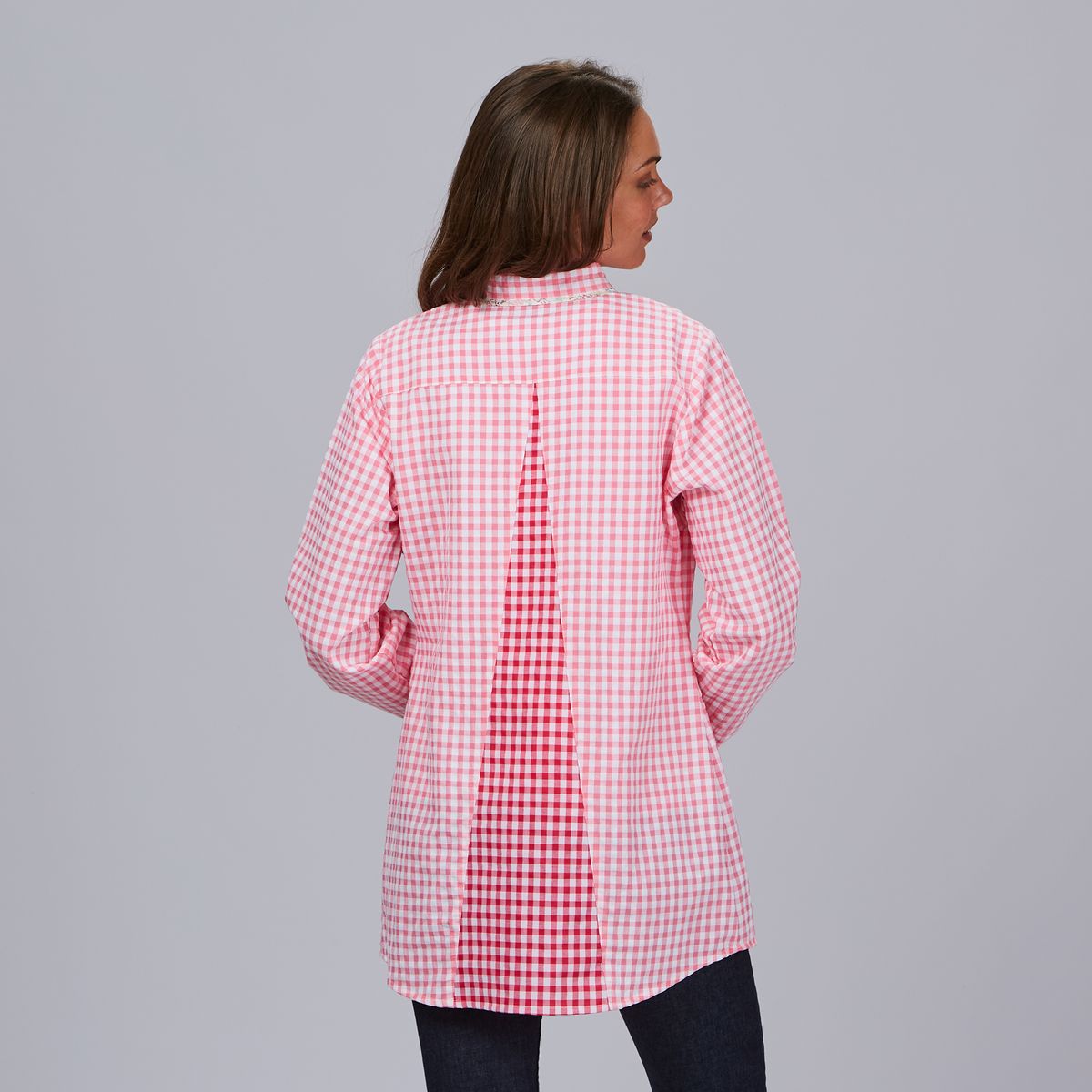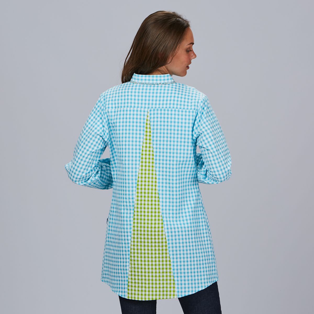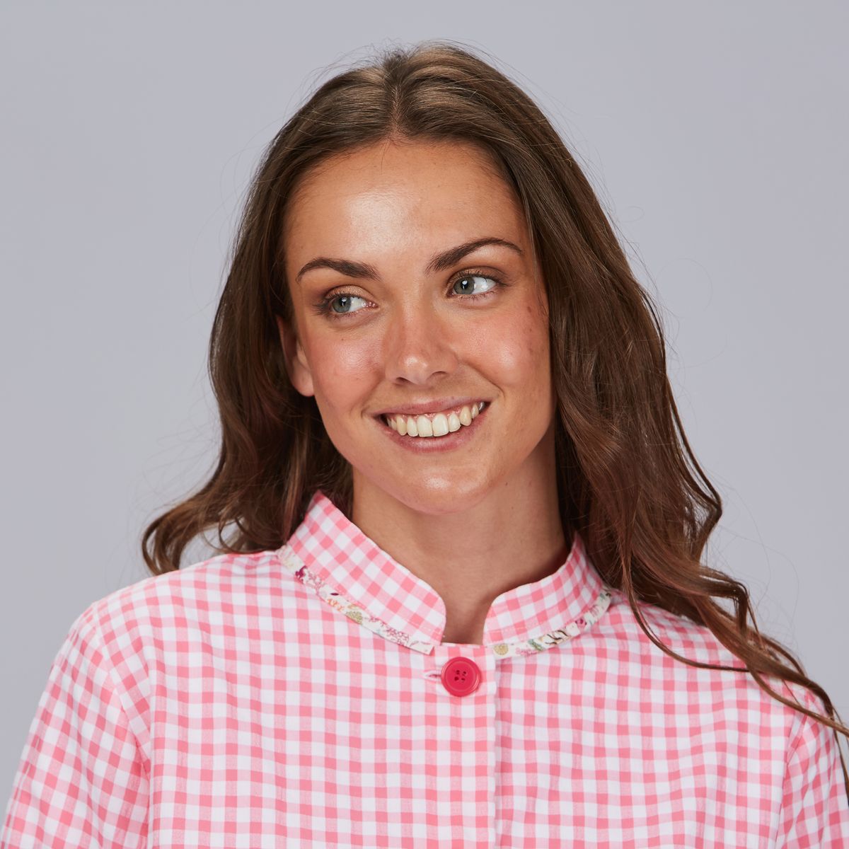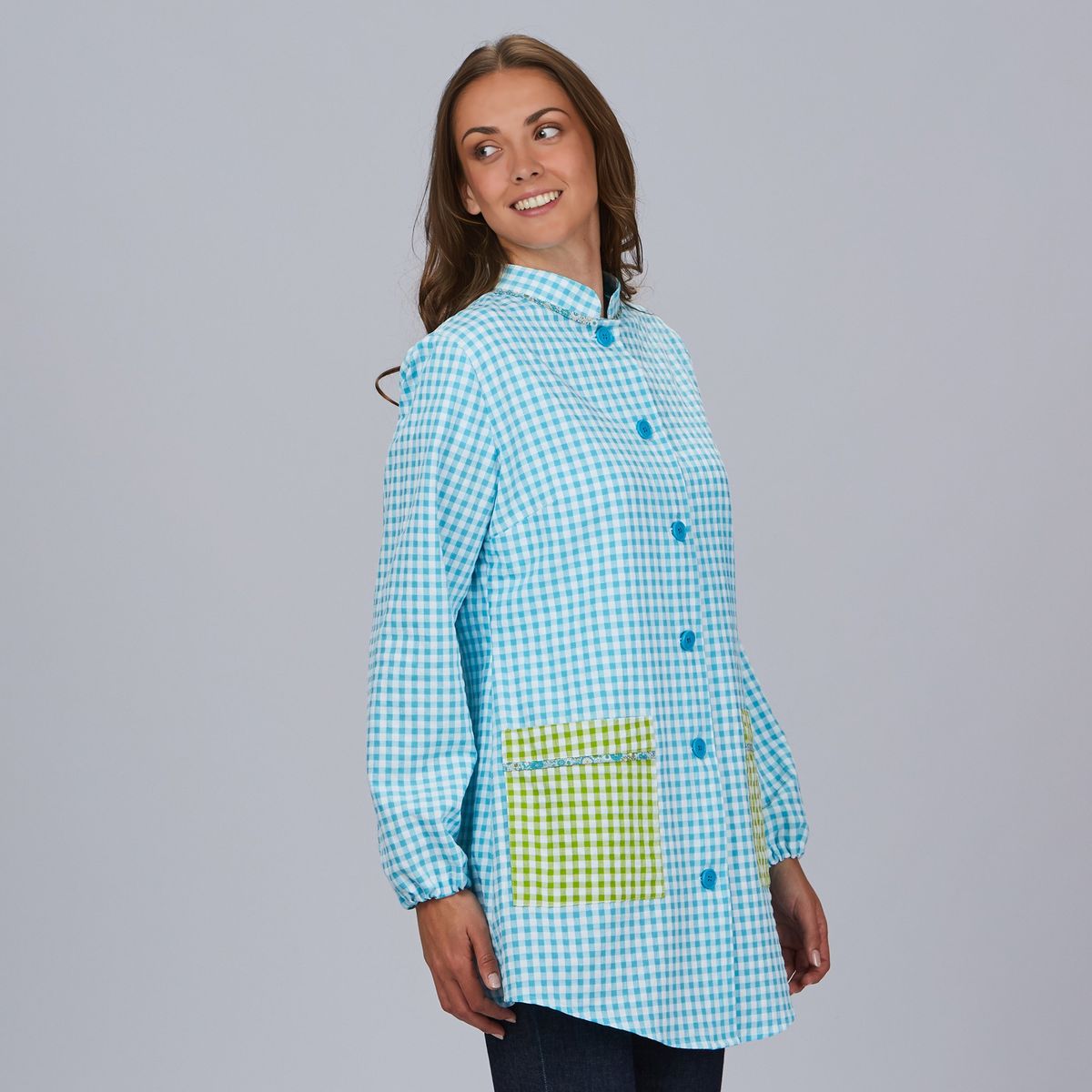 Aporta frescura, originalidad y compromiso al entorno laboral con esta bata, pensada para mujeres que valoran la funcionalidad sin renunciar al estilo ni a la sostenibilidad. El cuello mao con vivo estampado en todo el contorno, junto al canesú trasero, las pinzas delanteras y la pieza central trasera en color contrastante, estructuran la silueta con elegancia. Además, los bolsillos tipo parche en contraste aportan funcionalidad con un toque de color, mientras que las mangas con puño fruncido brindan confort en la rutina diaria. Confeccionada en bambula vichy, destaca por su ligereza, suavidad y respeto al medio ambiente. Disponible en dos combinaciones alegres —vichy verde agua y vichy rosa—, su diseño está lleno de detalles que marcan la diferencia.