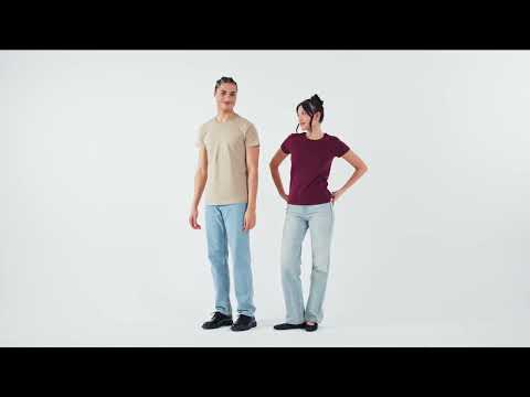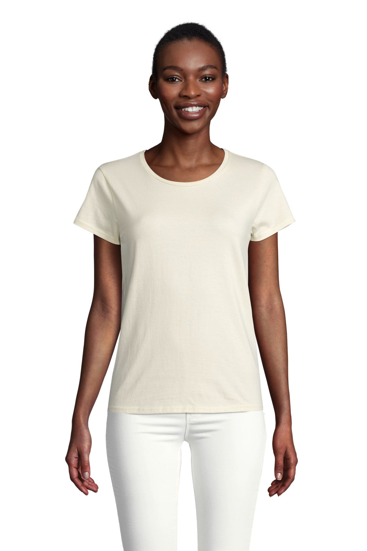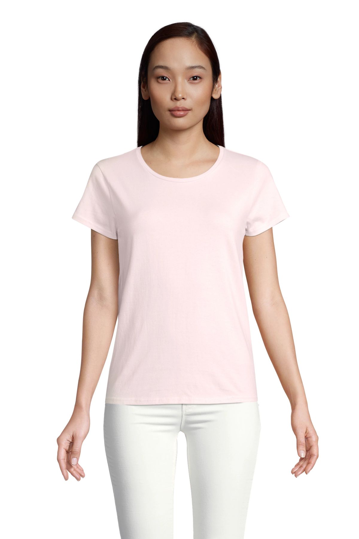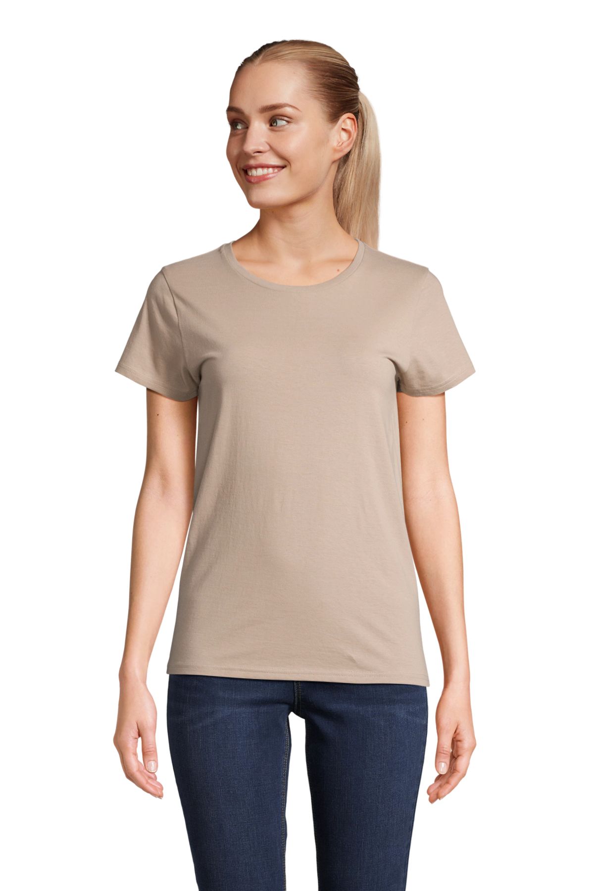 Camiseta de manga corta de algodón biológico para mujer. Ajustada de punto liso y cuello redondo. Disponible en gran variedad de colores.