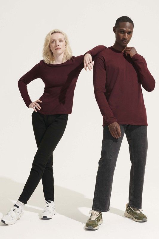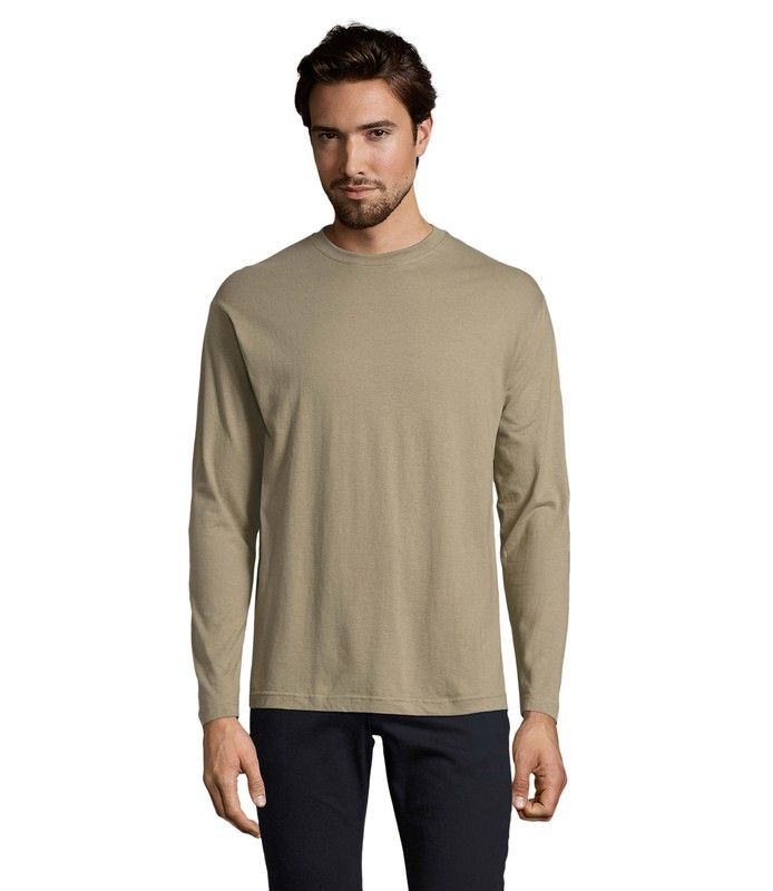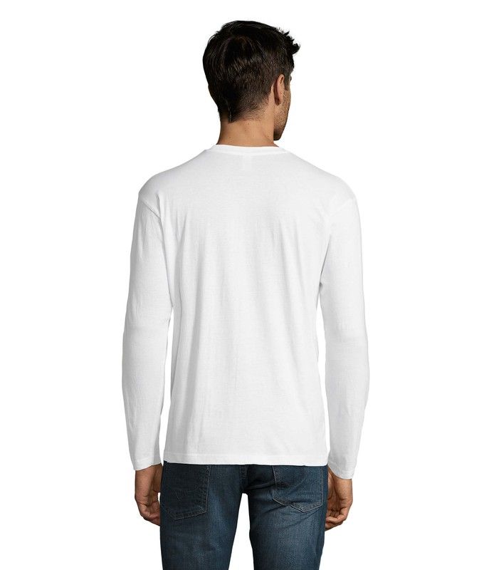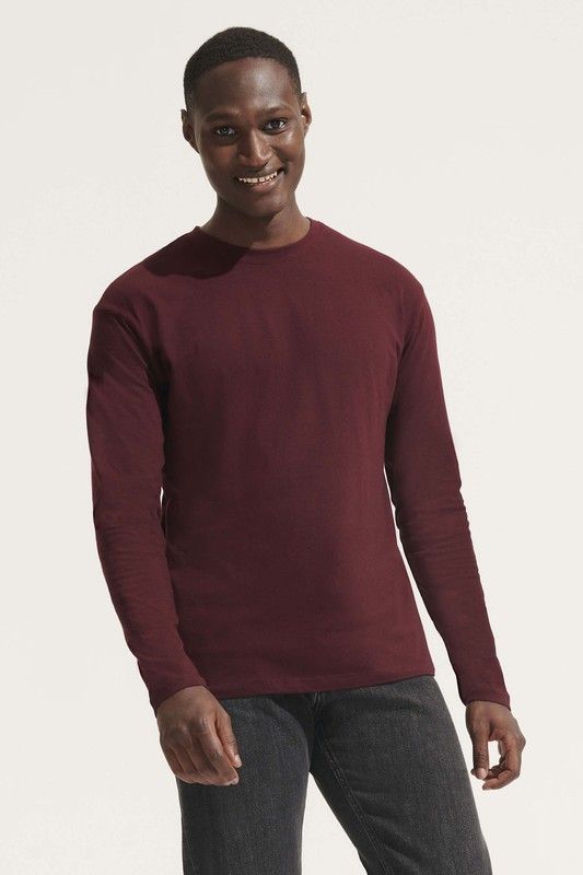 Camiseta de manga larga, de algodón. Disponible en color blanco, negro, azul marino, gris, caqui y borgoña. Tiene tapacosturas reforzado en el cuello, cuello redondo de punto acanalado con elastano, puños sin acabado acanalado.