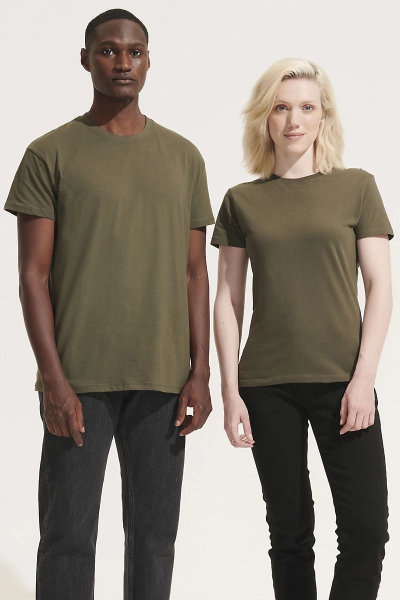 Camiseta básica unisex de manga corta, 100% algodón, en varios tonos de verde y azul.