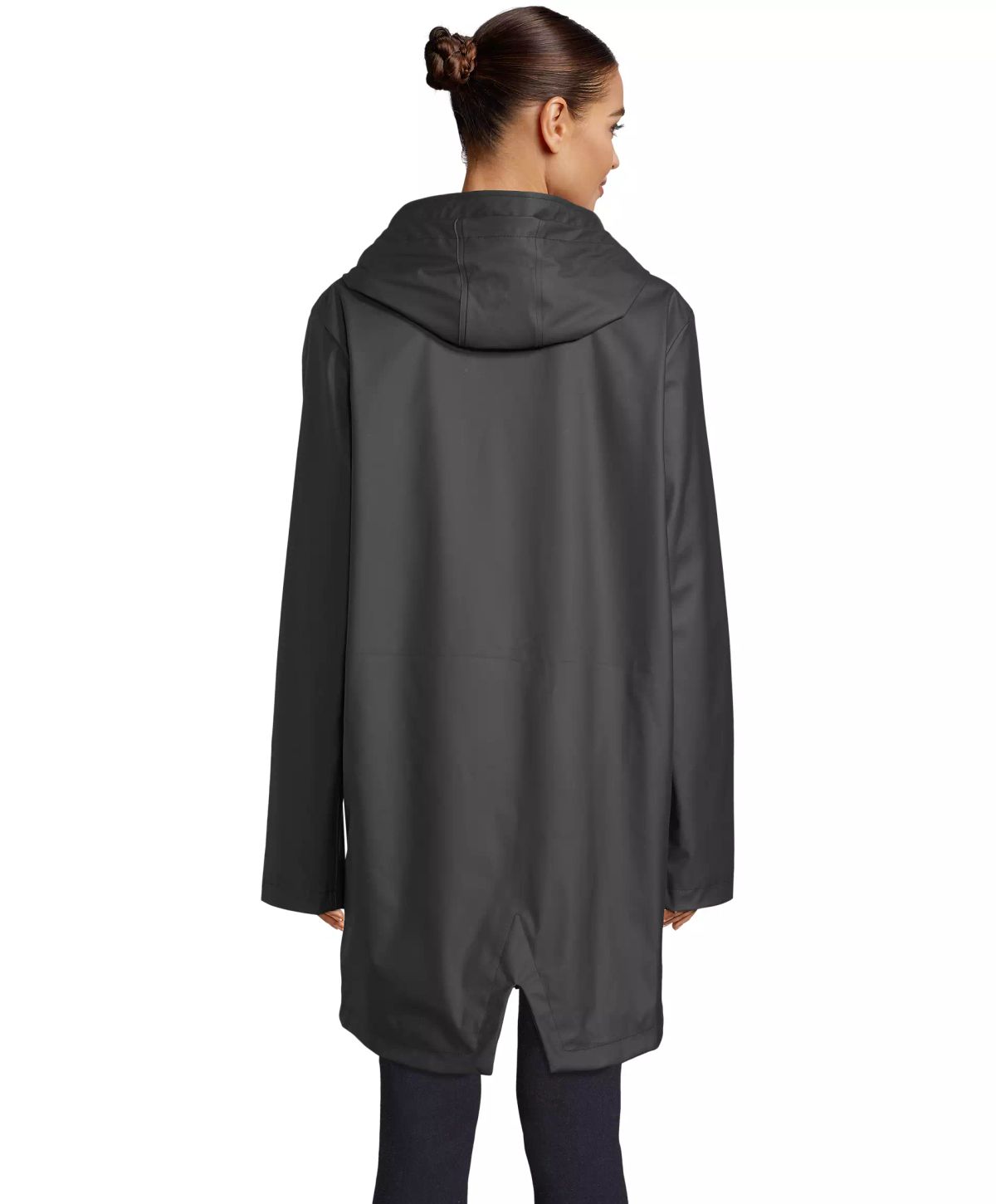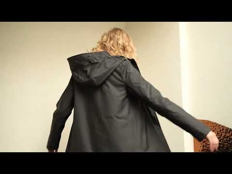 Chaqueta encerada impermeable para mujer con capucha. Abertura con cremallera impermeable y dos bolsillos también con cremallera. Abertura posterior en el bajo.