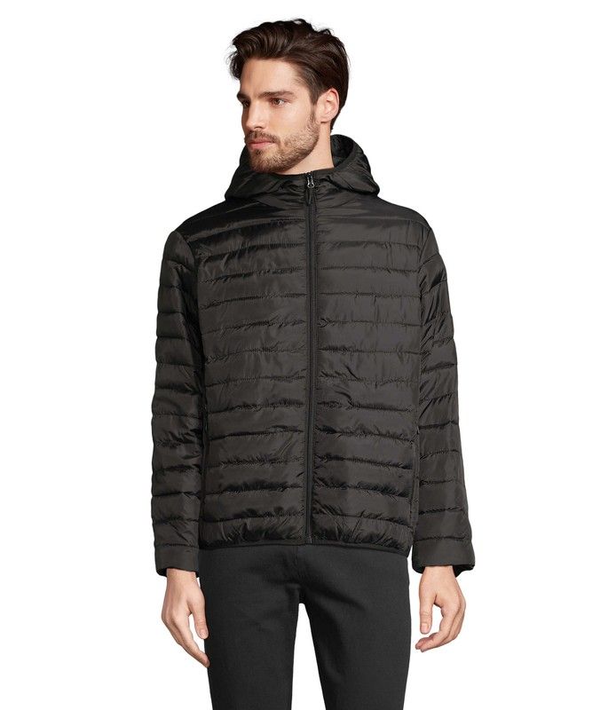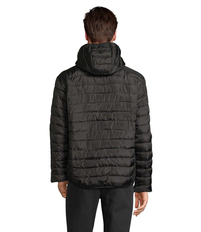 Chaqueta acolchada ligera con capucha para hombre. Bolsillos laterales con cremallera. Bajo y puños elásticos. También disponible el mismo modelo para mujer.