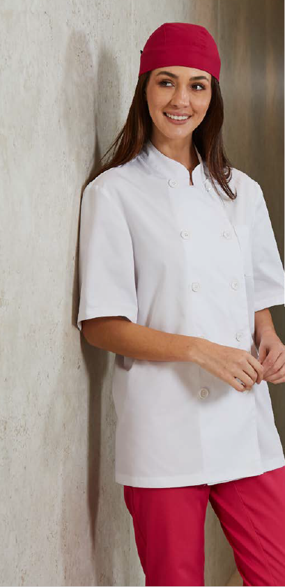 Esta chaqueta es unisex y cuenta con mangas cortas, lo que la hace adecuada para chefs y cocineros de cualquier género. Las mangas cortas permiten una mayor ventilación y comodidad en entornos de cocina calientes. La chaqueta presenta un cierre cruzado mediante botones de pastilla vistos. Esta característica no solo añade un toque de estilo, sino que también facilita ponerse y quitarse la chaqueta rápidamente. El bolsillo en el pecho izquierdo es práctico para guardar pequeñas herramientas, bolígrafos o dispositivos móviles, lo que permite tener acceso rápido a lo que se necesita en la cocina. El diseño semi ajustado de la chaqueta proporciona una apariencia profesional sin restringir el movimiento. Los costadillos en la espalda contribuyen a un mejor ajuste y comodidad. La chaqueta está confeccionada en tejido de popelín de color blanco, que es ligero y transpirable, ideal para entornos de cocina donde la comodidad es esencial. Esta chaquetilla de cocina es un básico esencial para cocineros y chefs que desean rendimiento y estilo en su vestuario de trabajo. Su diseño unisex y su comodidad la hacen adecuada para una amplia gama de entornos de trabajo en la industria alimentaria.