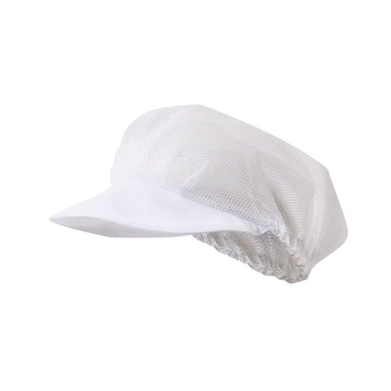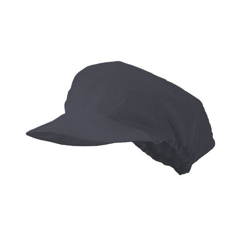 Cofia unisex de rejilla para cocineros y ayudantes de cocina. Disponible en negro y en blanco. Visera rígida. Zona elástica en todo el perfil. Transpirable. Recoge el pelo.
