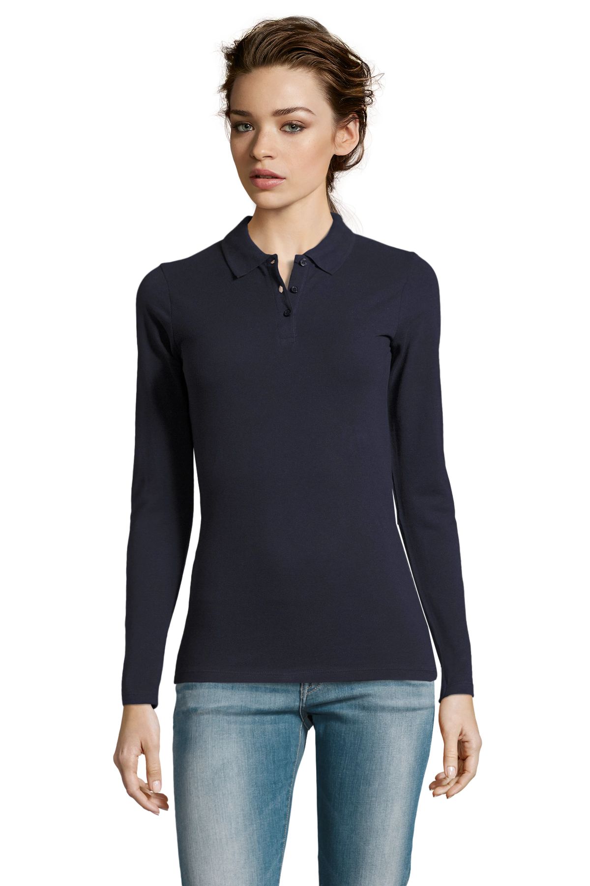 Polo de mujer ajustado en manga larga. Disponible en color blanco, negro, gris mezcla, gris antracita, naranja, rojo, oxblood, azul royal, marino, verde manzana o verde botella.