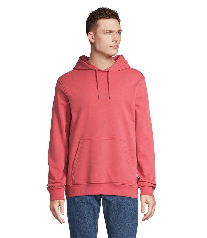 Sudadera unisex disponible en varios colores. Con bolsillo canguro y capucha. Acabado de acanalé 2x2 en puños y bajo. Media luna y tapacosturas de punto liso en el cuello. Cordón de ajuste con ojales y topes de metal.